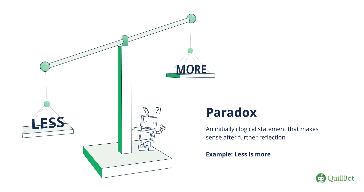 A paradox is a literary device in which a deeper truth is masked as a seemingly illogical proposition, like “less is more.” Writers use paradoxical statements because they invite the reader to think about the deeper meaning of a phrase and highlight the complexities of life.