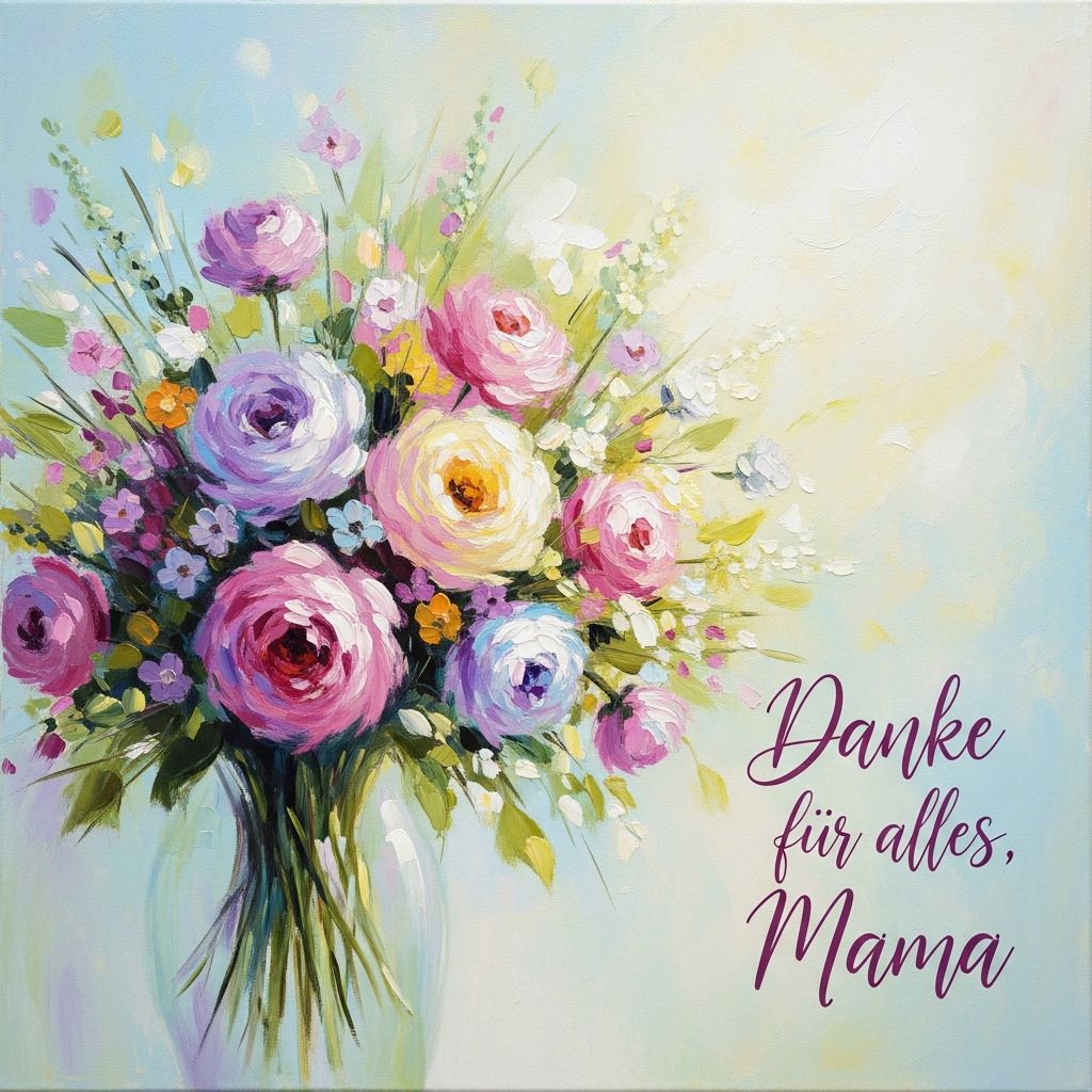 - Ölgemälde mit Glasvase und pastellfarbenen Blumen in Rosa, Lila und Gelb auf hellem Hintergrund. Text: „Danke für alles, Mama.“