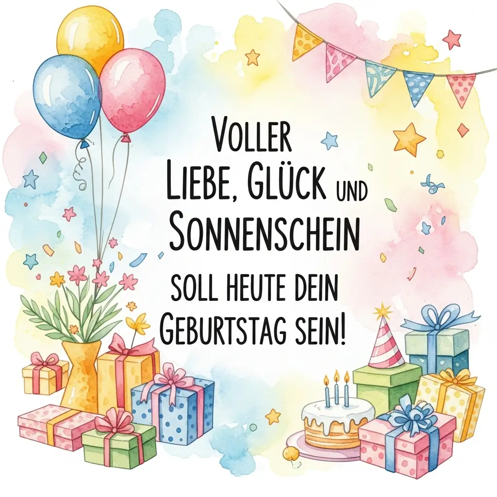 - Alles Liebe zum Geburtstag! Wir wünschen dir leckeren Kuchen 🎂, bombastische Geschenke 🎁, strahlenden Sonnenschein ☀️ und dass heute alle lieb zu dir sind! 💖